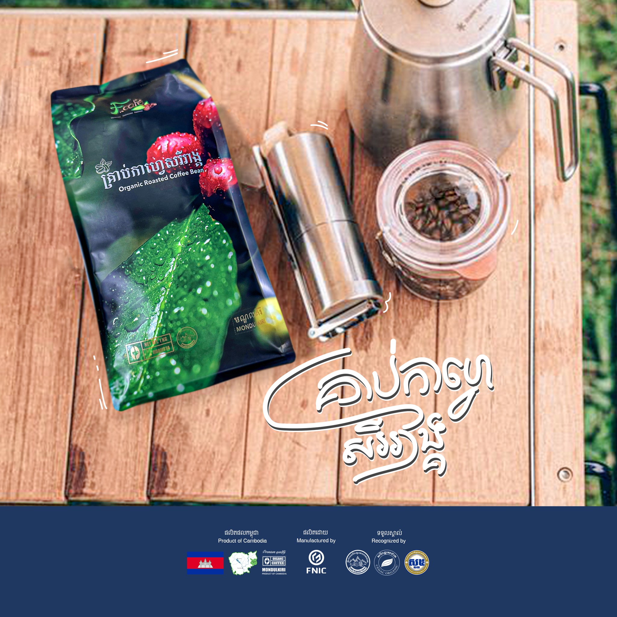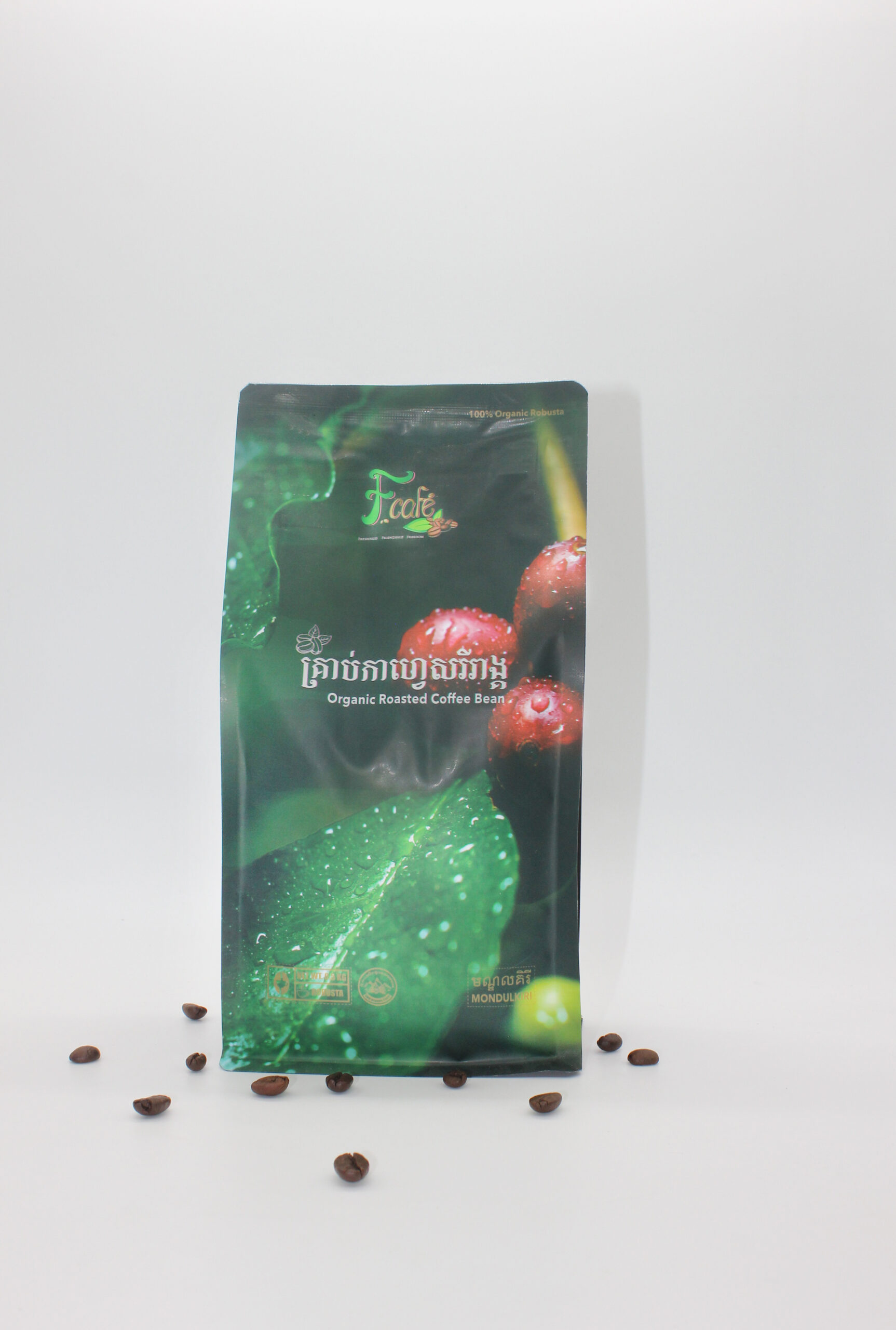 F Café Roasted Coffee Bean is the Robusta that is planted by indigenous community in Mondulkiri province and certified by the CEDAC Organic standard.